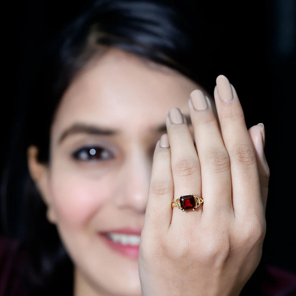Embrace yourself with the captivating beauty of this Solitaire Ring adorned with an 8 MM Asscher Cut Garnet gemstone securely placed in the double prong setting along with Celtic Knots on either sides. This single stone ring beholds the shine of AAA quality Garnet which will add spark to an ordinary day when you present it to her. This Garnet Engagement Ring will symbolize passion, creativity, and strength which makes it the perfect choice for making her feel special. This Celtic Engagement Ring will be shipped in a Premium Jewelry Box for safe and secured delivery and storage later.