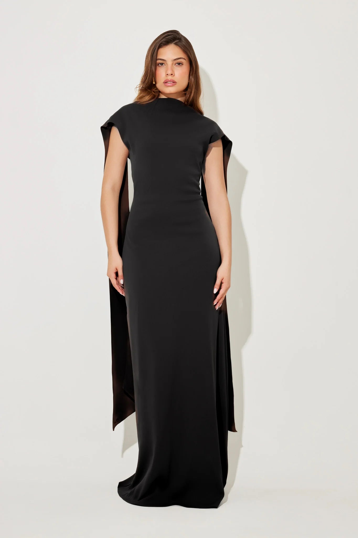 If elegance was a dress, she would be it muses. Adorned with delicately draped shoulders that lead into an open low cut back and creates a sophisticated high cowl neckline to complete this flattering party favourite, where simplicity creates opulence.