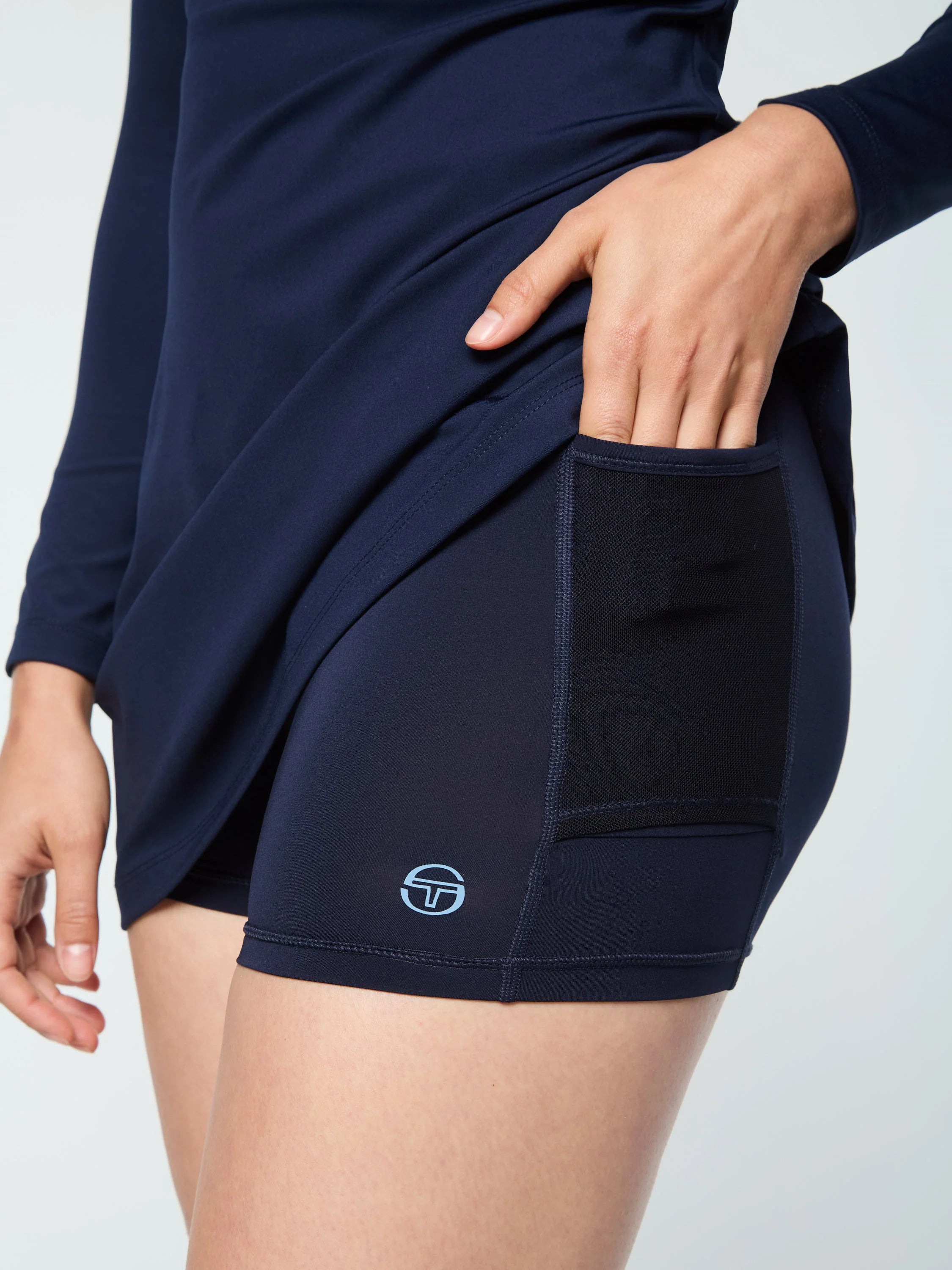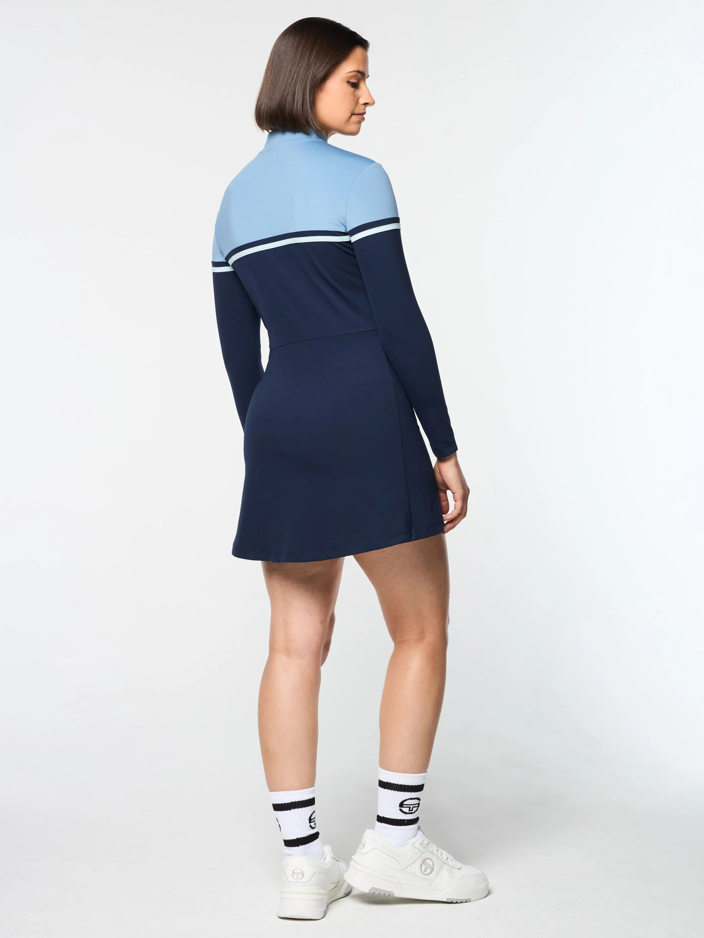 Description A tennis classic for contemporary times, our color-blocked Istrana Dress is crafted from buttery-soft 4-way stretch fabric that's made to move with you through your workout to your everyday. Designed with a water-repellent aqua-guard zip placket at the front for easy venting, this fitted long sleeve dress includes supportive undershorts with ball & phone pockets for convenience on the court & beyond.