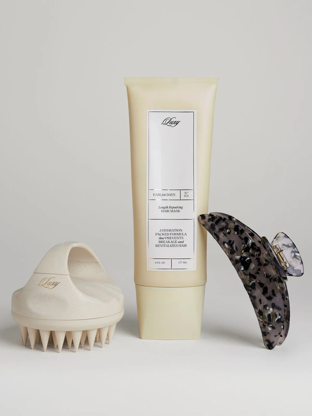 Cheers to healthy hair, in shortness and in length. The Something Nourishing Hair Kit is specially curated to pamper you and your wedding party for the big day. Includes the Length Repairing Hair Mask, the Root Rescue Massager, and the Speckled Claw Clip in Pewter. Designed for hair extensions. Safe for your own hair. Made with clean and organic ingredients.