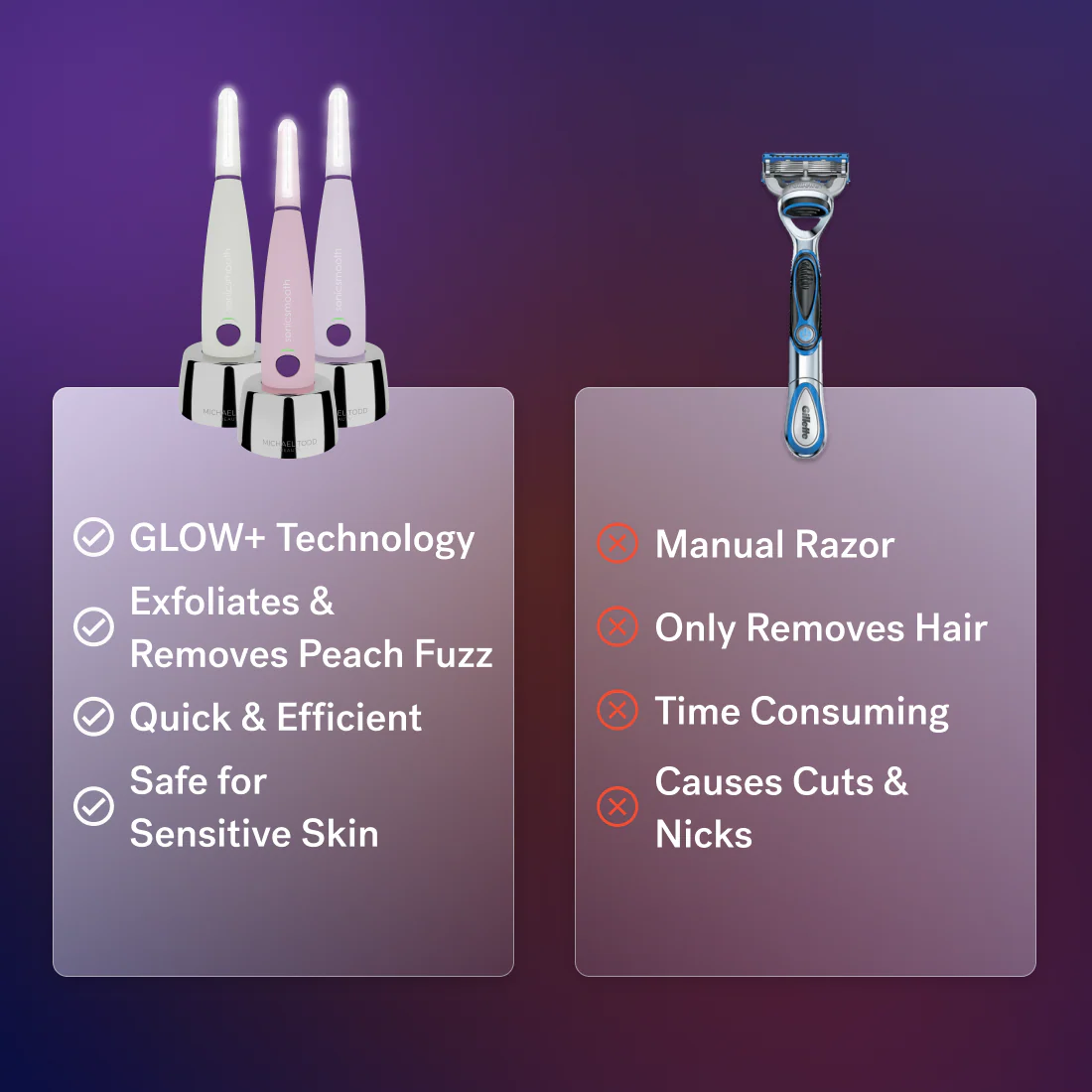 Sonicsmooth Pro+ is dermatologist approved for quick, easy, and painless exfoliation and peach fuzz removal.