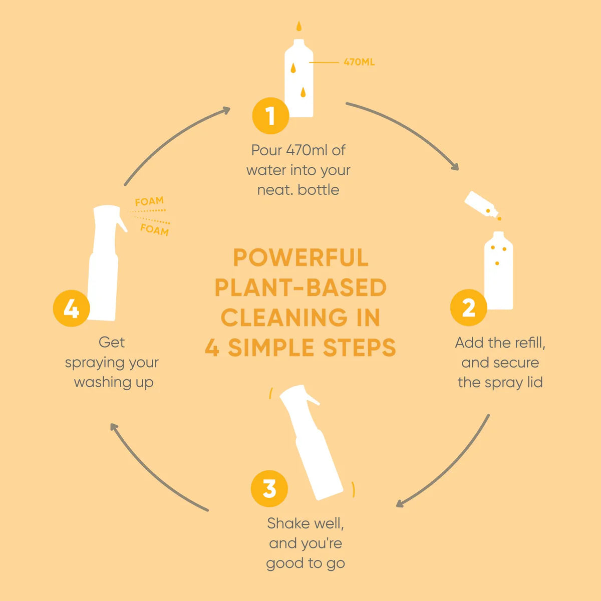 Powerful foaming and cleaning action.Our unique formula creates a rich foam that penetrates and lifts away tough grease and grime, leaving your dishes spotless and squeaky clean.Bottles designed to look good, and do good.Bottles designed to look good on your sink and help you reduce single-use plastic.Plastic-free refills that save space. plastic and water waste.We've removed the unnecessary water from our refills leaving you with everything you need for clean, nourished handsPlanet-friendly, plant-based formulas.Packed full of powerfully plant-based ingredients that are tough on dirt, without harsh chemicals.Concentrated, Plastic-Free RefillsWe've removed all of the unnecessary water, packing active ingredients into our tiny refills that save space, water and plastic waste.Plant-Based, Biodegradable IngredientsHigh strength eco-friendly formulas that are tough on dirt, without harsh chemicalVegan and Not Tested on AnimalsOur formulas are safe for you and your family.We're proud to be a certified B CorpWe're certified for our social impact by B Lab, a global non-profit organisation.FAQWhat is a foaming washing up spray?A foaming washing-up spray is a convenient and efficient cleaning solution designed specifically for washing dishes. It combines the cleaning power of a washing-up liquid with the ease of a spray format, creating a foam that effectively cuts through grease and grime on dishes. Cutting down on time and water use.With neat's foaming washing up spray all you need to do is spray, wipe then rinse for sparkling results.What's included in the Discovery Kit?The Foaming Washing Up Spray Discovery Kit includes everything you need to get started on your refillable journey.You'll receive 1x Reusable Foam Spray Bottle and 4x Refills.Do I have to subscribe?No, you can choose to purchase the discovery bundle as a one-time order and come back to buy Refills any time.How do I manage my subscription?There are many ways you can manage your subscription, including switching refill scents, skipping an order, changing your next delivery date or cancelling your subscription.If you are having any trouble managing your subscription then please reach out to our customer service team who are always happy to help.How long does a Refill last?For a typical household, each foaming washing up spray refill lasts approximately 30 days.How should I care for my bottle and pump so that they last?We recommend you clean your bottle after each refill. Simply rinse the bottle with warm water. To clean the trigger, fill the bottle with clean warm water and spray a few times into the sink. The silicon base can also be removed for cleaning. Give everything a wipe so it stays looking fresh and clean.