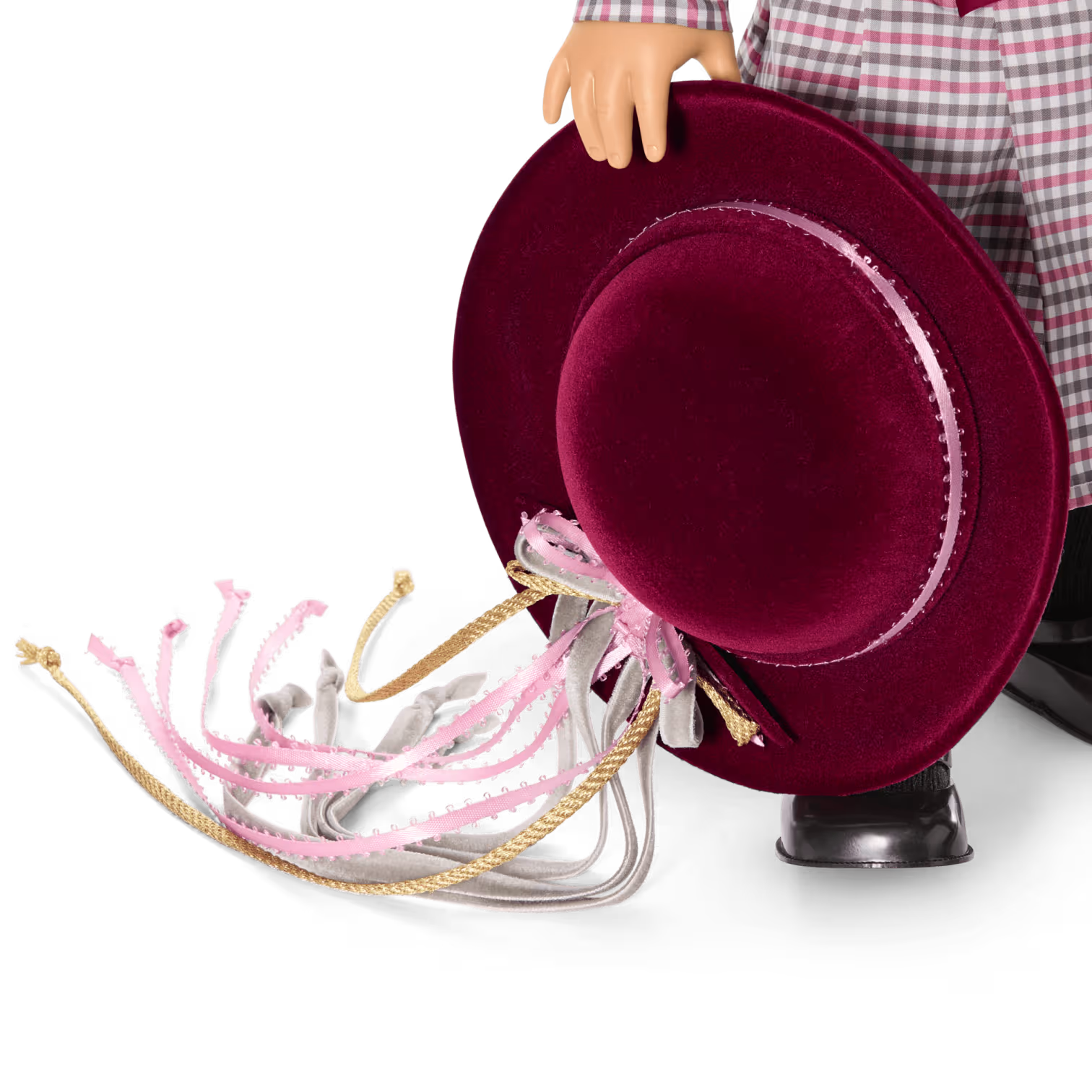 - A wide hairbow made of the same taffeta as her dress, a plush burgundy hat trimmed with ribbon, and a golden metal bow-shaped brooch with a heart pendant
